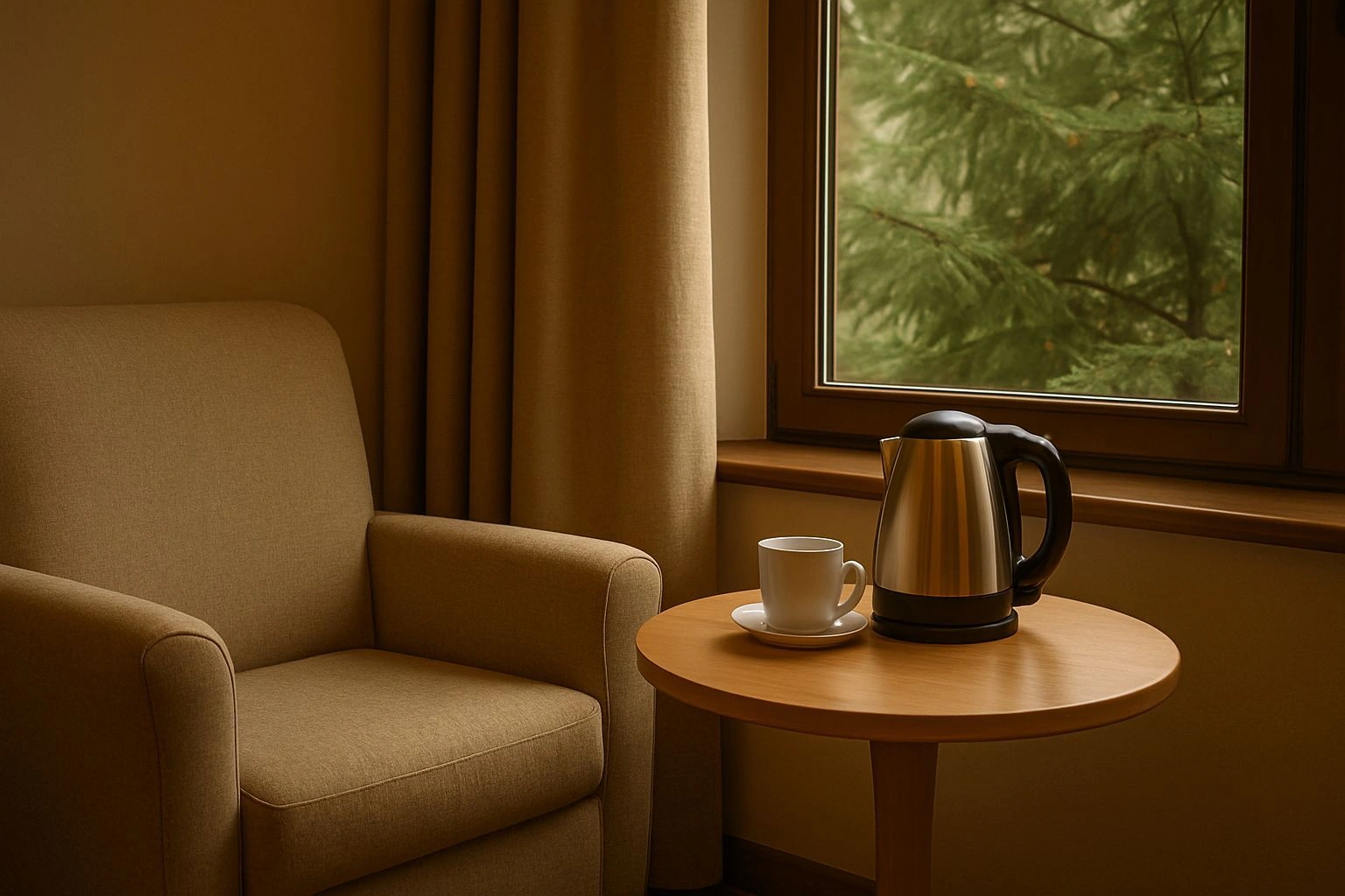 Granlys er et standardrom som kombinerer enkel funksjon med naturens rolige uttrykk. Rommet har dobbeltseng, lettlest belysning og en liten krok for å sette seg med en bok eller en kopp te. Badet har dusj, varme i gulvet og praktisk oppbevaring. Utsikten mot granskogen gjør at rommet føles skjermet, og lyset filtreres mykt gjennom trekronene. Dette er et rom for deg som vil bo godt uten unødvendige detaljer.