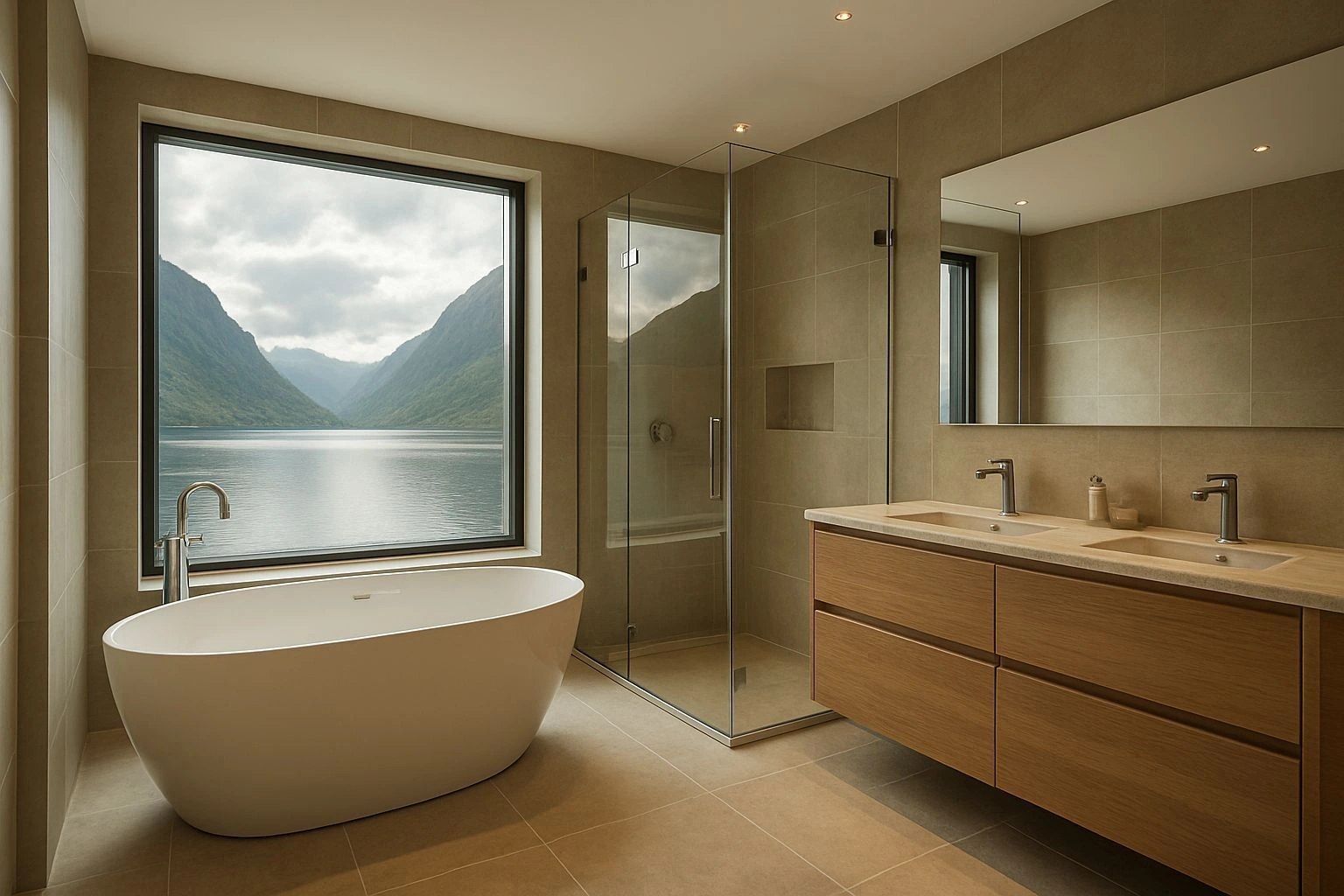 Fjordglød er et luksusrom som gir en åpen utsikt mot fjorden og en tydelig følelse av plass. Rommet har en ekstra bred dobbeltseng, en stor sittegruppe og en skriveplass i heltre. Badet er romslig med dusj og badekar, varme i gulvet og myk belysning. Utsikten og materialene gjør rommet til et stille pusterom for gjester som ønsker det lille ekstra.